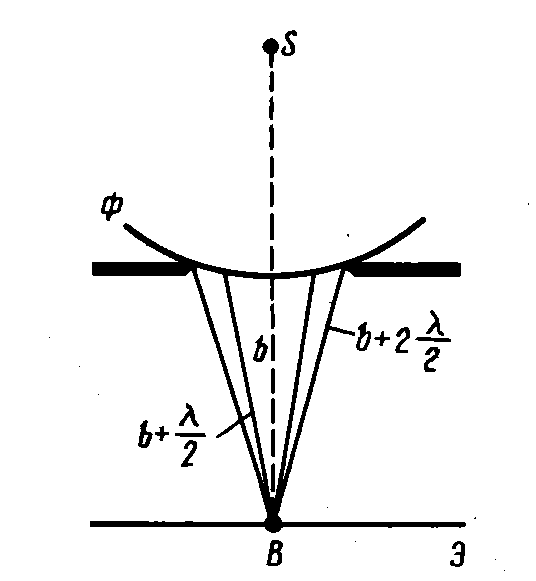 Первый из них с помощью метода зон Френеля объясняется так. Если в отверстии укладывается большое число зон Френеля, то для нахождения суммарного их действия в точке О нужно учитывать не только существование разности хода от двух соседних зон, но еще и плавное убывание амплитуды колебаний, возбуждаемых зонами, все более далекими от центральной зоны. Будем считать, что действие второй зоны в точке О полностью компенсируется действием прилегающих к ней половин первой и третьей зон, а действие четвертой зоны компенсируется действием прилегающих к ней половин третьей и пятой зон и т. д. Продолжая рассуждать таким образом, мы придем к выводу, что освещенность в точке О, создаваемая в результате сложения действия от всех вторичных источников, расположенных на