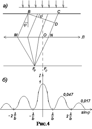 Пусть параллельный пучок монохроматического света падает нормально на непрозрачный экран, в котором прорезана узкая щель ВС, имеющая постоянную ширину b и длину l>>b (см. рис.4,а). Оптическая разность хода между крайними лучами ВМ и CN, идущими от щели под углом j к оптической оси линзы OF0 D= CD = b sin j.