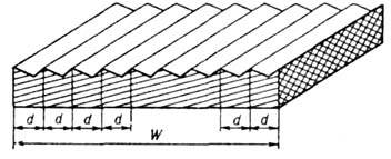 Рис. 1. Схема одномерной периодической структуры плоской дифракционной решётки (сильно увеличено): d - период решётки; W - длина нарезной части решётки.