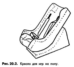 Это кресло, охватывающее тело со всех сторон, очень удобно для того, чтобы малыш с тяжелой формой церебрального паралича мог играть на полу. У такого ребенка резко повышен мышечный тонус (высокая спастичность), его поза несимметрична, поэтому ему удобно сидеть с полной поддержкой в таком кресле. Оно изготовлено из плотного упругого пеноматериала и обтянуто мягкой моющейся тканью. Сиденье снабжено подушкой-абдуктором для разведения бедер и ремнями. Клиновидная подставка обеспечивает вертикальное положение кресла, ее можно убрать – и оно станет наклонным. В таком кресле (рис. 20.2) ребенка можно кормить.