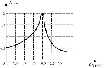 На рисунке представлена зависимость амплитуды колебаний груза на пружине с жесткостью k = 10 Н/м от частоты внешней силы.