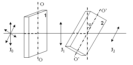 На рисунке показаны две пластинки турмалина, на которые падает пучок естественного света. После прохождения пластинки 1 свет полностью поляризован. J 1 и J 2 интенсивности света, прошедшего пластинки соответственно. Угол между направлениями OO и O’O’ j = 0°. J 1 и J 2 связаны соотношением …