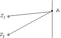 На рисунке показаны два когерентных источника S 1 и S 2 монохроматического излучения с длиной волны 600 нм. Оптическая разность хода лучей от этих источников до точки А равна 1,2 мкм.