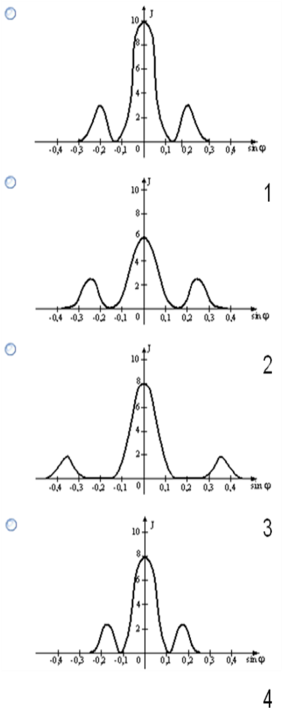 Одна и та же дифракционная решётка освещается различными монохроматическими излучениями с разными интенсивностями. Случаю освещения решётки светом с наименьшей постоянной решетки соответствует рисунок (J - интенсивность света, j - угол дифракции) …