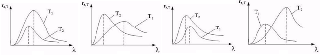 На рисунках по оси абсцисс отложена длина волны теплового излучения тела, по оси ординат - излучательная способность. Кривые соответствуют двум температура, причем T1 < T2. На качественном уровне правильно отражает законы излучения АЧТ рисунок...