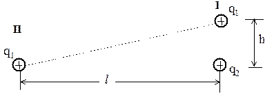 | Записан закон сохранения энергии для двух положений заряженного шарика q1 в общем виде: Ер1 + Ер2 = Ер + Ек, где Ер1 - потенциальная энергия заряда q1 в поле тяготения (положение I), Ер2 - потенциальная энергия заряда q1 в электрическом поле заряда q2 (положение I), Ер - потенциальная энергия зарядов в положении II, Ек - кинетическая энергия заряда q1 в положении II. | |||