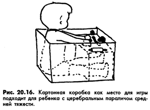 Прочная картонная коробка – прекрасное место для игр: самые разные игрушки можно подвесить к стенкам коробки или положить на дно, внутрь можно поставить маленькую коробку-стол (рис. 20.16). Подчеркнем еще раз – ребенок не должен сидеть пассивно и неподвижно, и картонная коробка прекрасно подходит для развития движений. Сидя в ней, ребенок может передвигаться, пытаться вставать и т. д.