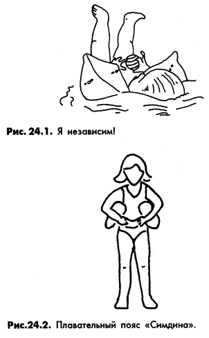 На рис. 24.2 изображен плавательный пояс «Симдина» (Simdyna) компании «Свидиш Роло Пластике» (Swedish Rolo Plastics). Я советую пользоваться им, поскольку такая конструкция позволяет ребенку плавать лежа на спине или на животе (если его перевернуть) с вытянутыми ногами.[12]
