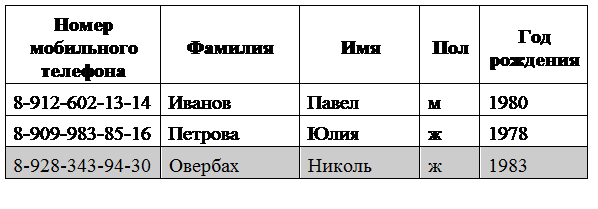 Примером простой реляционной базы данных может служить таблица «Респонденты», где одна строка (запись) — сведения об одном из участников телефонного опроса.
