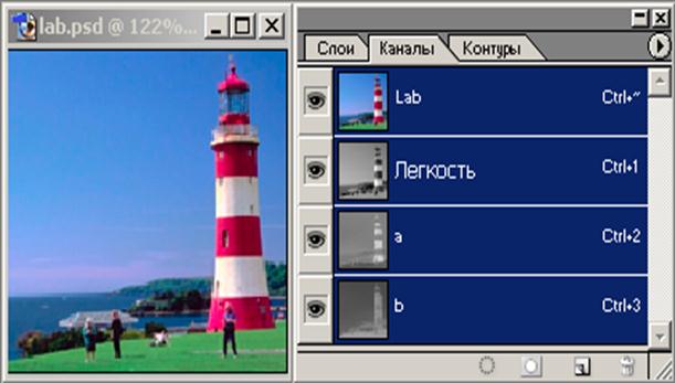 Рис. 14. Полноцветное изображение в модели Lab и его представление в цветовых каналах