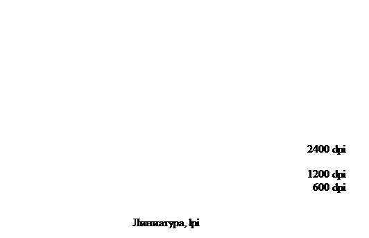 На рисунке 18 в графической форме наглядно представлена зависимость тонального разрешения печатающего устройства от установленного для него значения линиатуры полиграфического растра. Графики зависимостей построены для устройств вывода с наиболее распространёнными значениями пространственного разрешения.