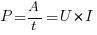 Мощность тока (Р) в цепи равна работе (А) тока, выполняемой за единицу времени (t), и определяется произведением напряжения (U) на силу тока (I).