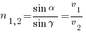 2) Относительный показатель преломления второй среды относительно первой (n1,2), равный отношению синуса угла падения (α) к синусу угла преломления (γ), для данных двух сред есть величина постоянная, зависящая только от скоростей (v1 и v2) распространения света в этих средах.