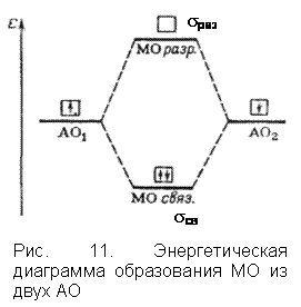 4. Если энергия МО оказывается ниже энергии исходных АО, то такие МО – связывающие, а если выше энергии исходных АО, то – разрыхляющие МО (рис. 11).