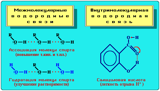 Внутримолекулярная водородная связь образуется при благоприятном пространственном расположении в молекуле соответствующих групп атомов и специфически влияет на свойства. Например, Н-связь внутри молекул салициловой кислоты повышает ее кислотность.
