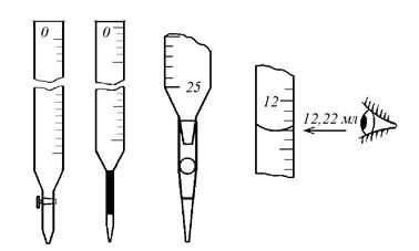 Пипетки. Пипетки (рис. 1, б) предназначены для точного отмеривания определенного объема жидкости и переноса ее из одного сосуда в другой (отбор аликвотных частей). Эту операцию производят следующим образом. Чистую пипетку берут большим и средним пальцами правой руки за ее верхний конец, погружают нижний конец на 3 – 4 см в жидкость и всасывают ее приблизительно до половины пипетки. Быстро закрывают верхнее отверстие пипетки указательным пальцем, вынимают пипетку из жидкости, наклоняют пипетку почти горизонтально и, не отпуская указательный палец, поворачивают ее так, чтобы жидкость обмыла стенки, затем выливают ее. Ополаскивание пипетки повторяют. Для отбора аликвотной части погружают конец пипетки в жидкость, всасывают ее до уровня немного выше метки и закрывают верхнее отверстие указательным пальцем. Затем приподнимают пипетку над жидкостью и, ослабив нажим указательного пальца, медленно, по каплям, выпускают избыток жидкости до тех пор, пока нижний край мениска не коснется метки (глаза должны находиться на одном уровне с меткой), в этот момент плотно прижимают указательный палец и прекращают тем самым вытекание жидкости. Если на кончике пипетки остается капля, ее удаляют прикосновением конца пипетки к стенке сосуда. Для выливания жидкости из пипетки опускают в соответствующий сосуд нижний конец пипетки, открывают верхнее отверстие и дают жидкости свободно вытечь, затем слегка касаются носиком пипетки дна или стенки сосуда, держат так пипетку приблизительно 10 с и вынимают ее из сосуда. В носике пипетки всегда остается жидкость.