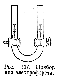 Знак заряда коллоидных частиц может быть установлен на опыте, так как под действием постоянного электрического тока положительные коллоиды передвигаются к катоду, а отрицательные – к аноду. При изучении этого явления (называемого электрофорезом) исследуемый гидрозоль помещают в нижнюю часть снабженной кранами U–образной трубки (рис. 147), затем закрывают оба крана, промывают верхнюю часть прибора, заполняют ее водой и опускают в последнюю электроды.После открывания обоих кранов и включения постоянного тока в трубке начинает происходить электрофорез. Передвижение коллоидных частиц от одного полюса к другому особенно легко наблюдать в случае цветных золей непосредственно по изменению уровней окрашенного слоя жидкости в обоих коленах трубки.