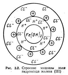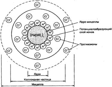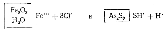 Например, в состав полученного гидролизом FeCl3 гидрозоля окиси железа, кроме Fe2 O3,входят еще вода, адсорбированные коллоидной частицей ионы Fe3+и окружающие ее в жидкой фазе ионы Сl–. Общая формула мицеллы этого гидрозоля имеет вид xFe2 O3 ·yH2 O·zFe3++ 3zCl–, а формула гранулы – xFe2 O3 ·yH2 O·zFe3+ .Подобным же образом общая формула мицеллы гидрофобного золя As2 S3 имеет вид xAs2 S3 ·zSH– + zH, a гранулы – a:As2 S3 ·zSH–. Схематически это часто изображают так: