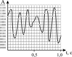 На рисунке 19б диапазон колебаний звуковой волны представлен 16-ю уровнями градации интенсивности (амплитуды) звука. Для записи номера каждого из этих уровней (от 0 до 15) в двоичном коде потребовалось 4 ячейки или 4 бита памяти (16 = 24).