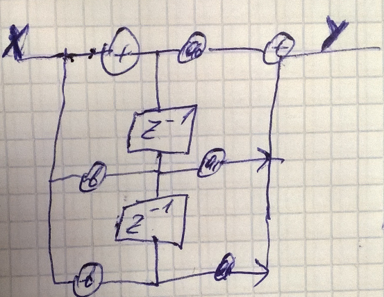 3. По z-передаточной функции строится цифровой фильтр, который реализуется программно в виде алгоритма.