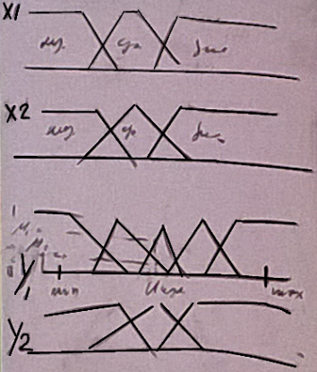 Допустим, у нас есть 2 сигнала – подача топлива (х1) и степень торможения (х2). Пусть х1 и х2 имеют по 3 значения – низкое, среднее, высокое. y1 может быть очень низкое, низкое, среднее, высокое, очень высокое. у2 низкая, средняя, высокая.