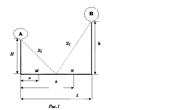 Рыбаку нужно переправиться с острова А на остров В (рис.1). Чтобы пополнить свои запасы, он должен попасть на участок берега MN. Найти наикратчайший путь рыбака