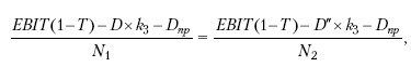где N 1 – количество акций с учетом нового выпуска; N 2 – прежнее количество акций в обращении; D″ – величина заемного капитала с учетом привлечения новых кредитов, облигационных займов; Dпр – дивиденды по привилегированным акциям; k 3 – цена заемного капитала после налогообложения.