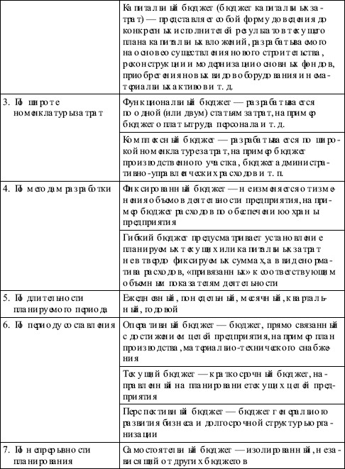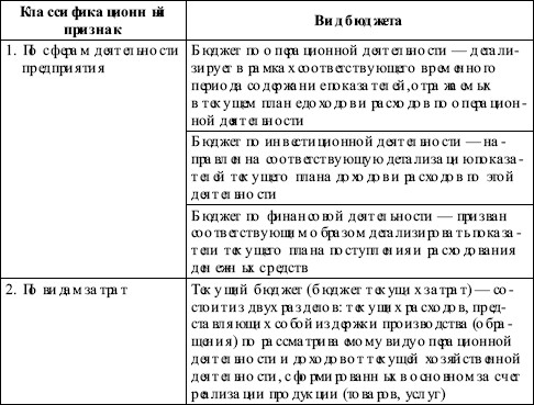 Бюджеты могут иметь множество видов и форм. В отличие от формализованных отчета о прибылях и убытках или бухгалтерского баланса, бюджет не имеет стандартизированной формы, которая должна строго соблюдаться. Структура бюджета зависит от того, что является предметом бюджета, размера организации, степени, в которой процесс составления бюджета интегрирован с финансовой структурой предприятия, от квалификации и опыта разработчиков и т. д. Такое многообразие бюджетов обусловливает необходимость классификации их по ряду потенциально возможных на практике характерных признаков.