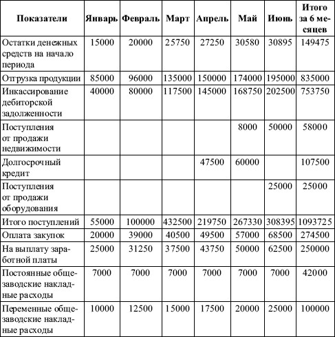 Существует иной способ планирования денежных поступлений, основанный на составлении графика погашения задолженности покупателей. Так, если по результатам анализа состава дебиторской задолженности и характера ее движения известно, что в среднем 40 % задолженности погашается в квартале ее возникновения, 30 % – в следующем квартале, 20 % – в третьем квартале, а 10 % обязательств остаются неоплаченными, можно составить график ожидаемых поступлений. Прогнозирование прочих поступлений, как правило, бывает затруднено вследствие их эпизодического характера (штрафы, пени, неустойки к получению и т. д.).