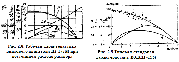 На рис. 2.8-2.9 приведены рабочие характеристики винтовых забойных двигателей Д2-172м и ДГ-155.