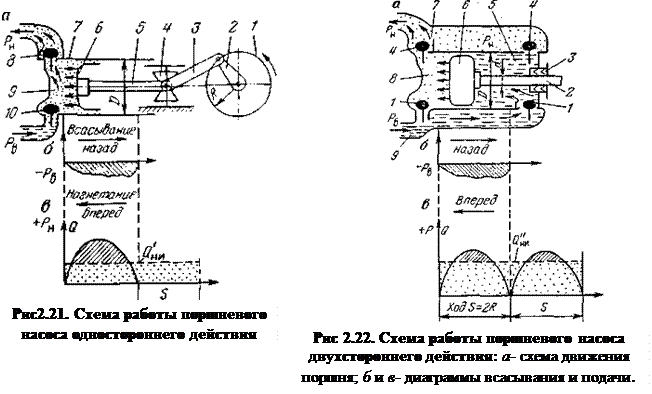 На рис. 2.21 и рис.2.22 представлены схемы работы поршневых насосов одностороннего и двухстороннего действия.