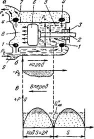 Поскольку нагнетание жидкости происходит за счет вытеснения ее из рабочей камеры поршнем, очевидно, количество жидкости, вытесняемой в единицу времени — подача насоса,— будет изменяться по тому же закону, что и скорость поршня, как показано на графике (рис.2.21, в). Если обозначить ход поршня через S, его площадь через F, то объем жидкости Vц, вытесненной из камеры при ходе влево,