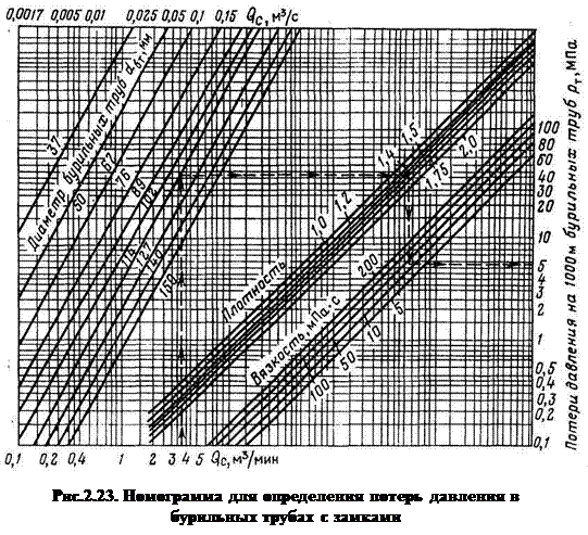 По номограмме на рис. 2.23 находим потери давления на 1000 м длины бурильных труб при бурении:
