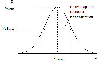 Положение максимума полосы поглощения (lмакс) соответствует длине волны такого электромагнитного излучения, энергия которого равна энергии необходимой для электронного перехода. Для характеристики ширины полосы поглощения используются величиной полуширины полосы поглощения. Интенсивность поглощения, которую можно охарактеризовать с помощью молярного коэффициента поглощения, зависит от вероятности данного электронного перехода. Поглощение с eмакс > 104 считается интенсивным (максимально возможное значение e составляет примерно 2×105), поглощение с eмакс < 103 считается малоинтенсивным.