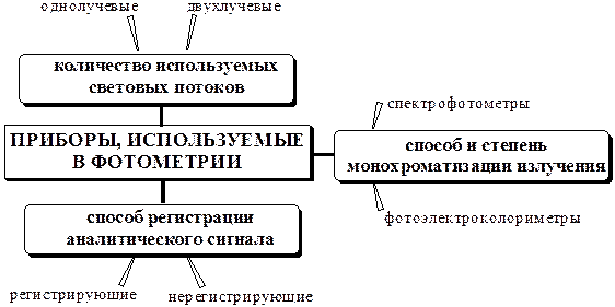 Источники излучения, используемые в фотометрии, дают непрерывные спектры. В зависимости от того, каким образом происходит выделение из непрерывного спектра испускания источника нужного спектрального интервала, абсорбционные спектрометры можно разделить на 2 класса: фотоэлектроколориметры и спектрофотометры.