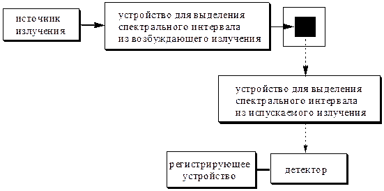 Измерение флуоресценции, в отличие от измерения поглощения, чаще всего проводят под прямым углом к направлению возбуждающего света. Такой приём позволяет избежать наложения возбуждающего света на излучаемый. При измерении интенсивности фосфоресценции, либо при большом Стоксовом сдвиге, можно использовать схему, при которой источник возбуждения, образец и детектор находятся на одной оптической оси. В данном случае возбуждающий свет не мешает определению, так как при измерении интенсивности фосфоресценции измерение проводят после прекращения действия возбуждающего света, а при большом Стоксовом сдвиге lвозб и lисп настолько различаются, что возбуждающий свет задерживается монохроматором и не попадает на детектор. В случае сильно поглощающих растворов, полупрозрачных и твёрдых образцов используют фронтальный способ, при котором измерение флуоресценции проводится под углом 45° относительно возбуждающего излучения.