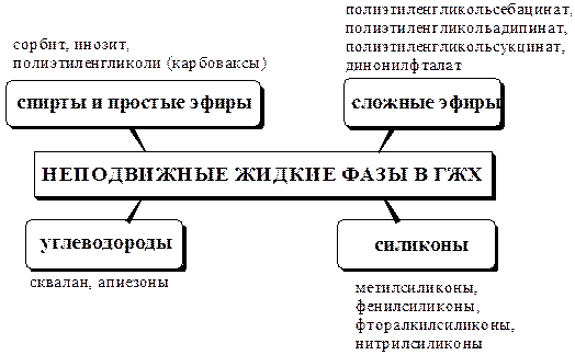 Сквалан, апиезоны, метилсиликоны являются неполярными жидкими фазами. Среднюю полярность имеют фенилсиликоны, фторалкилсиликоны, сложные эфиры фталевой кислоты, фосфорной кислоты и т.д. К полярным жидким фазам относят карбоваксы, полиэтиленгликольадипинат, полиэтиленгликольсебацинат, полиэтиленгликольсукцинат (ДЭГС), сорбит, инозит и т.д. Неполярные жидкие фазы используют для разделения неполярных веществ, например, углеводородов, галогенпроизводных углеводородов, сложных эфиров и др. Полярные неподвижные фазы, наоборот, применяют, в основном, для разделения полярных веществ: спиртов, фенолов, альдегидов, кетонов и т.д.