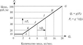 В табл. 5.3 показаны взаимоотношения между выбранными альтернативными ценами мяса и соответствующим количеством его предложения, при прочих равных условиях, указанных в колонке 4. Следует отметить, что данные предложения мяса и его цены увязаны простым уравнением Q = 2Р. При этом Р не может быть менее 10 руб. за 1 кг мяса. Если взять любую цену на мясо из колонки 2 и ввести ее в указанное уравнение, то можно рассчитать общие соответствующие затраты на количество предложения Q в колонке 3.