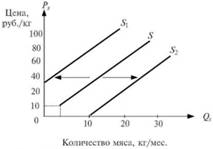 Изменение цен, например, на такие ресурсы, как объем и качество стада, пастбищ, труд человека (пастуха), влияет на предложение мяса. Кривая предложения на сдвиги в данных переменных реагирует смещением влево или вправо. Кривая S отражает данные рис. 5.5. Если цены на производственные факторы растут, то кривая смешается в направлении S → S1, а если падают, то в направлении S → S2.