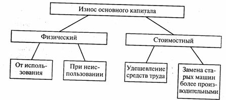 Особую заботу предприниматели проявляют о возмещении стоимости основного капитала, который требует постоянного возобновления. Такое непрерывное восстановление стоимости средств труда производится по определенным нормам в соответствии с их износом. Этот износ бывает двояким: 1) физическим и 2) стоимостным (рис. 9.2).