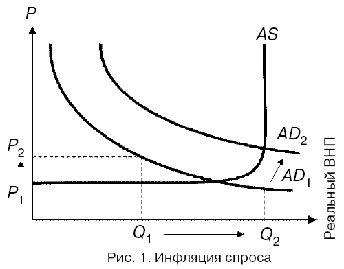 может быть представлена следующим образом. Совокупный спрос, превышающий текущие производственные возможности, вызывает повышение уровня цен. Инфляция, вызванная этим источником, начинается с роста цен на конечные продукты, который постепенно распространяется на факторы производства, причем рост цен на последние не поспевает за ростом цен на первые. В общем плане инфляция спроса обозначает нарушение равновесия между совокупным спросом и совокупным предложением. Сдвиг кривой совокупного спроса вправо от АD1 к АD2ведет к росту цен, если экономика находится на промежуточном или классическом отрезках кривой совокупного предложения.