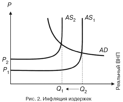 возникает в результате роста объема издержек, например, за счет сильного роста зарплаты, несоразмерного с ростом производительности труда. Как видно из графика (рис. 2), такой неблагоприятный шок предложения ведет к росту цен. Смещение кривой совокупного предложения влево (AS1 → AS2) в результате действия указанных причин отражает увеличение издержек на единицу продукции, при возрастании цен (P1 → P2) сокращается реальный объем производства (Q2 → Q1), или реальный ВНП.