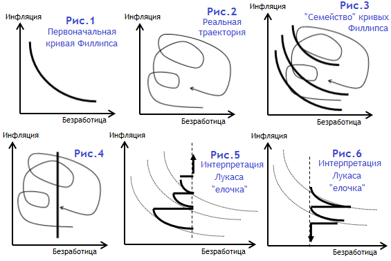 Однако при подгонке такой кривой к историческим данным было установлено, что траектория развития экономики имеет зигзагообразную форму (рис. 2) и по сути не совпадает с кривой, предложенной Филлипсом. В поисках истины одни допускали наличие целого «семейства» таких кривых, а экономика время от времени переходила с одной линии зависимости на другую (р. 3). Вторые утверждали, будто линия Филлипса представлена в виде обычной вертикальной прямой (р. 4), т.к. при одной и той же степени незанятости возможен сколь угодно высокий уровень инфляции. Третьи вообще ставили под сомнение, что взаимосвязь инфляции и безработицы существует.