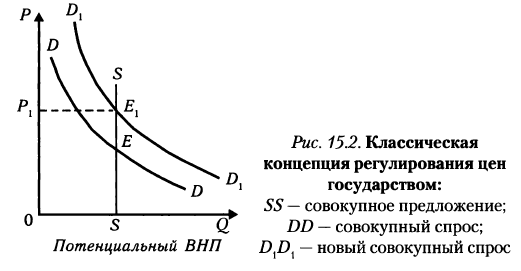 Классическая модель. Экономисты-неоклассики, исходя из гибкости цен заработной платы, процентной ставки, т.е. из того, что зарплата и цены могут свободно передвигаться вверх и вниз, отражая баланс между спросом и предложением, утверждают следующее. По их мнению, совокупное предложение (SS) имеет вид вертикальной прямой, отражающей потенциальный объем производства ВНП. Снижение цены влечет за собой снижение зарплаты, и поэтому полная занятость сохраняется, сокращения величины реального ВНП не происходит. Здесь вся продукция будет продана по другим ценам. Иначе говоря, снижение совокупного спроса ведет не к снижению ВНП и занятости, а лишь к снижению цен. Таким образом, классическая теория считает, что экономическая политика государства может воздействовать лишь на уровень цен, а не на объем производства и занятость. Поэтому вмешательство государства в регулирование объема производства и занятости нежелательно
