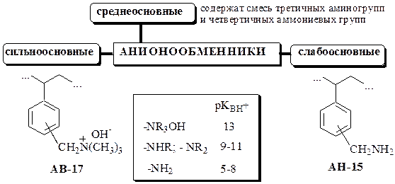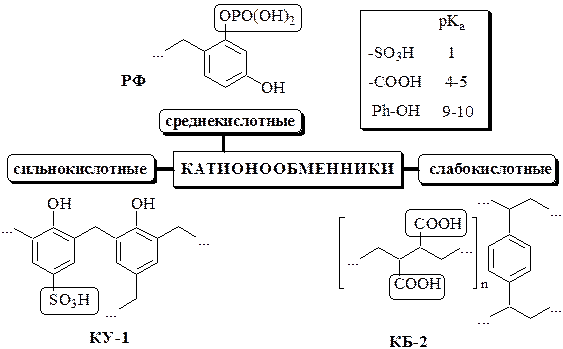 Катионообменники содержат в своей структуре ионогенные группы кислотного характера, анионообменники – основного. В состав амфотерных ионообменников входят и кислотные, и основные группы. Ионообменники, имеющие только один тип функциональных групп (например, только –SO3H), называются монофункциональными. Ионообменники, в состав которых входит более одного типа ионогенных функциональных групп (например, -SO3H и –OH), называются полифункциональными.