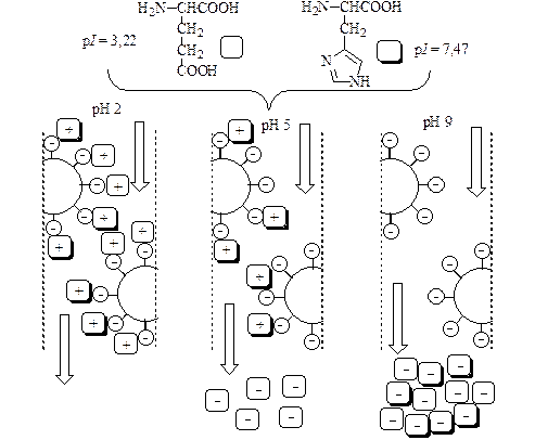 На рис. 24.6 показан пример ионообменного разделения двух аминокислот – глутаминовой кислоты и гистидина с использованием сильнокислотного ионообменника.