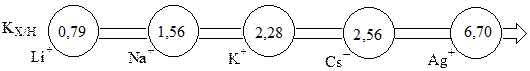 Величина коэффициента селективности зависит от размера и заряда иона, химической структуры ионообменника и условий проведения эксперимента. Например, для сильнокислотного катионообменника Dowex-50, содержащего 8% дивинилбензола: