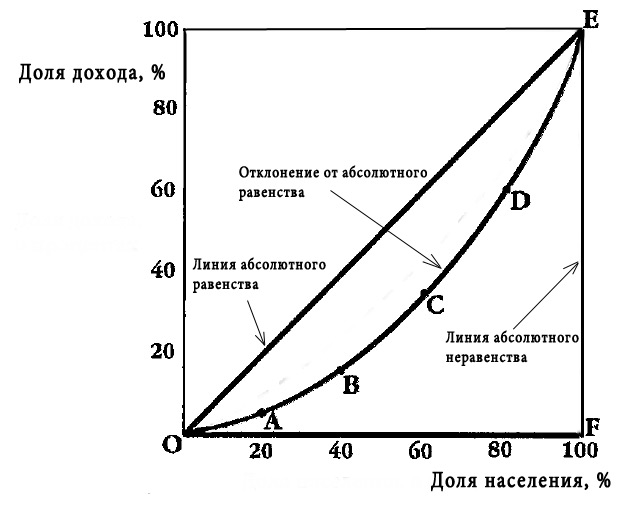 На оси абсцисс откладывается доля населения, а на оси ординат — доля доходов в обществе в процентном отношении. Как видно из графика, в обществе всегда имеет место быть неравенство в распределении доходов, что отражает кривая OABCDE — кривая Лоренца. Например, первые 20% населения могут получать 5% доходов, 40% населения — 15% доходов, 60% населения — 35% доходов, 80% населения — 60% доходов, ну и естественно 100% населения — 100% доходов.
