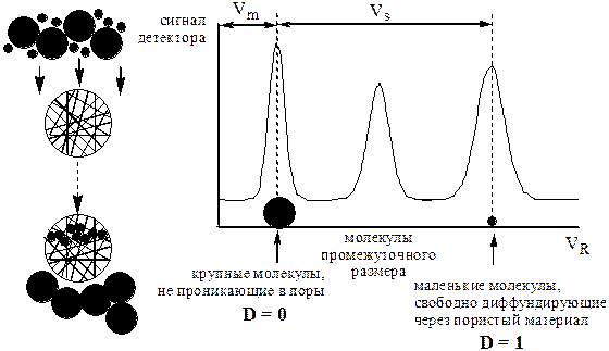 Величина коэффициента распределения (D) в эксклюзионной хроматографии может находиться в пределах от 0 до 1. Для крупных молекул, не способных проникать в поры геля, D = 0, следовательно, удерживаемый объём равен свободному объёму колонки - VR = Vm. В случае молекул, размер которых позволяет им свободно диффундировать через пористый материал, D = 1 (поскольку состав подвижной и неподвижной фаз одинаков), следовательно, удерживаемый объём равен сумме свободного объёма колонки и объёма жидкости, находящейся в порах – VR = Vm + Vs. Для молекул промежуточного размера Vm < VR < VS. Поскольку диапазон возможных значений D в эксклюзионной хроматографии очень узок, то для эффективного разделения в данном виде хроматографии приходится применять длинные колонки или несколько соединённых друг с другом колонок.