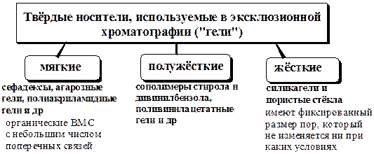 В качестве твёрдого носителя в гель-хроматографии используют различные сетчатые полимеры («гели»). Неподвижной фазой является элюент, находящийся в порах зёрен твёрдого носителя, подвижной фазой - этот же элюент, протекающий вдоль слоя частиц полимера. В процессе хроматографирования более мелкие молекулы проникают в поры геля и задерживаются в находящейся в них неподвижной фазе. Более крупные молекулы не проникают в поры и поэтому движутся быстрее. Таким образом, выход компонентов смеси из колонки происходит в порядке уменьшения их молекулярных масс (рис 24.10).